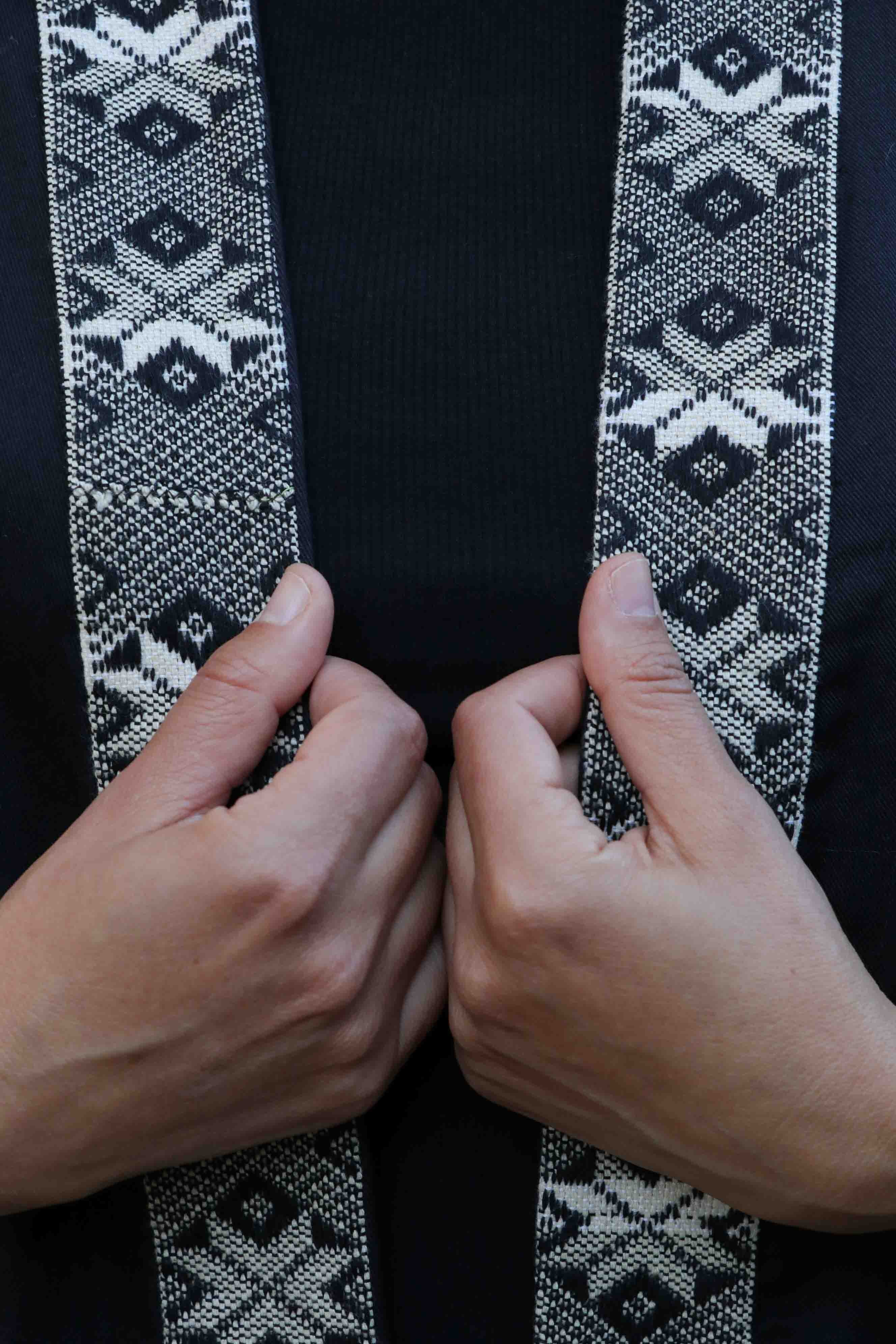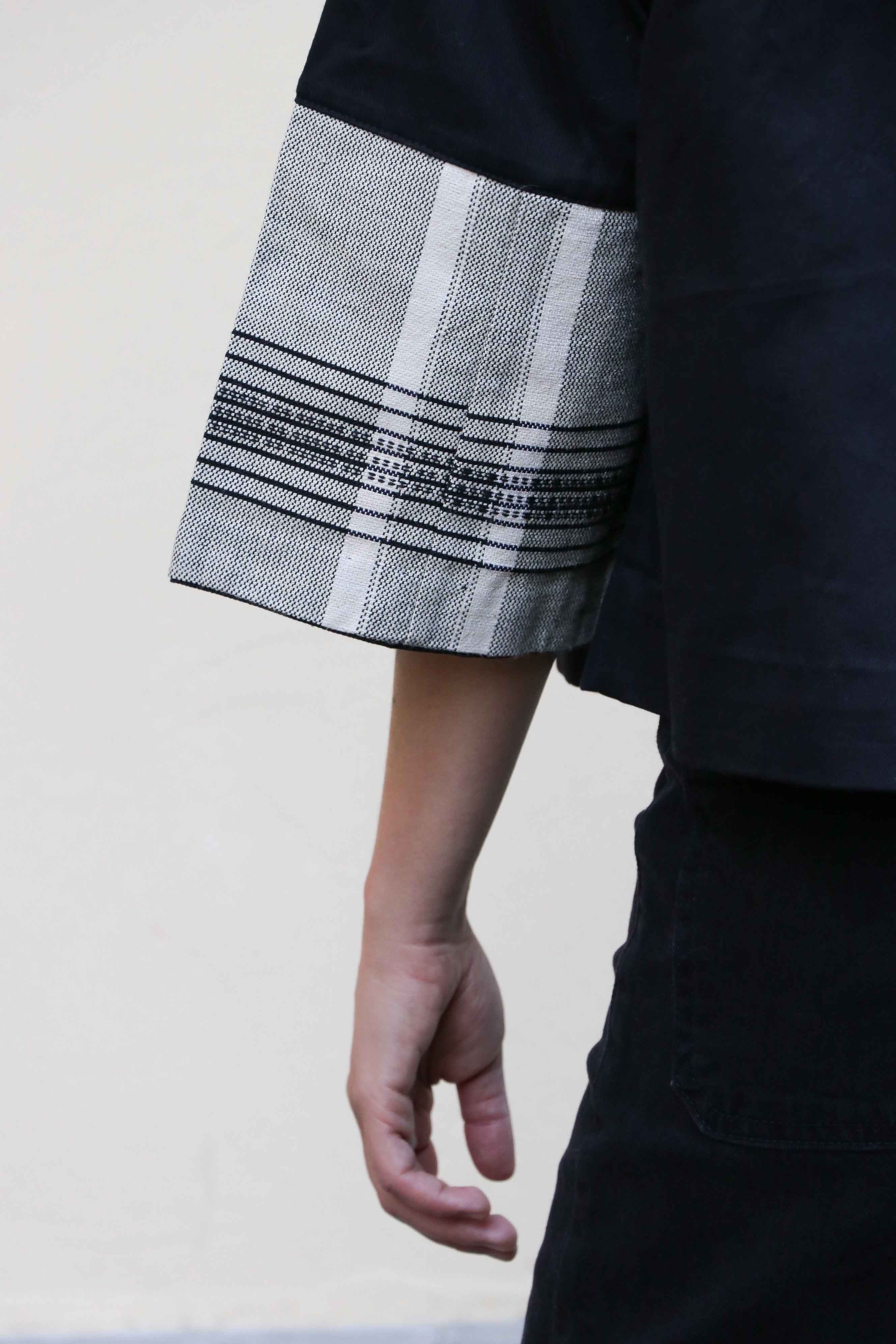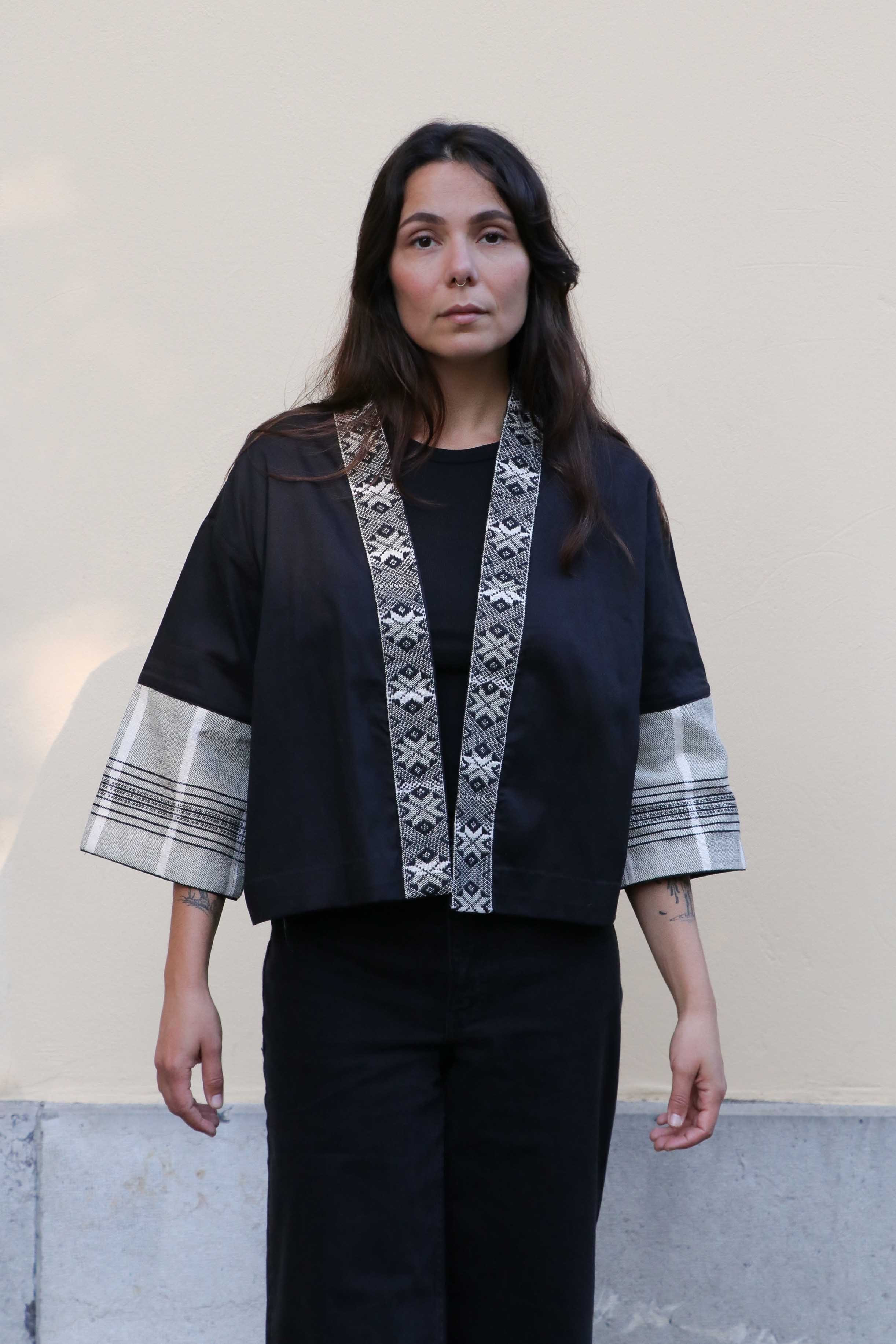 Kimono d’exception taille S/M réalisé à partir de coton recyclé et sublimé par une pièce de tissage créée par Zecka, artisan tisserand.