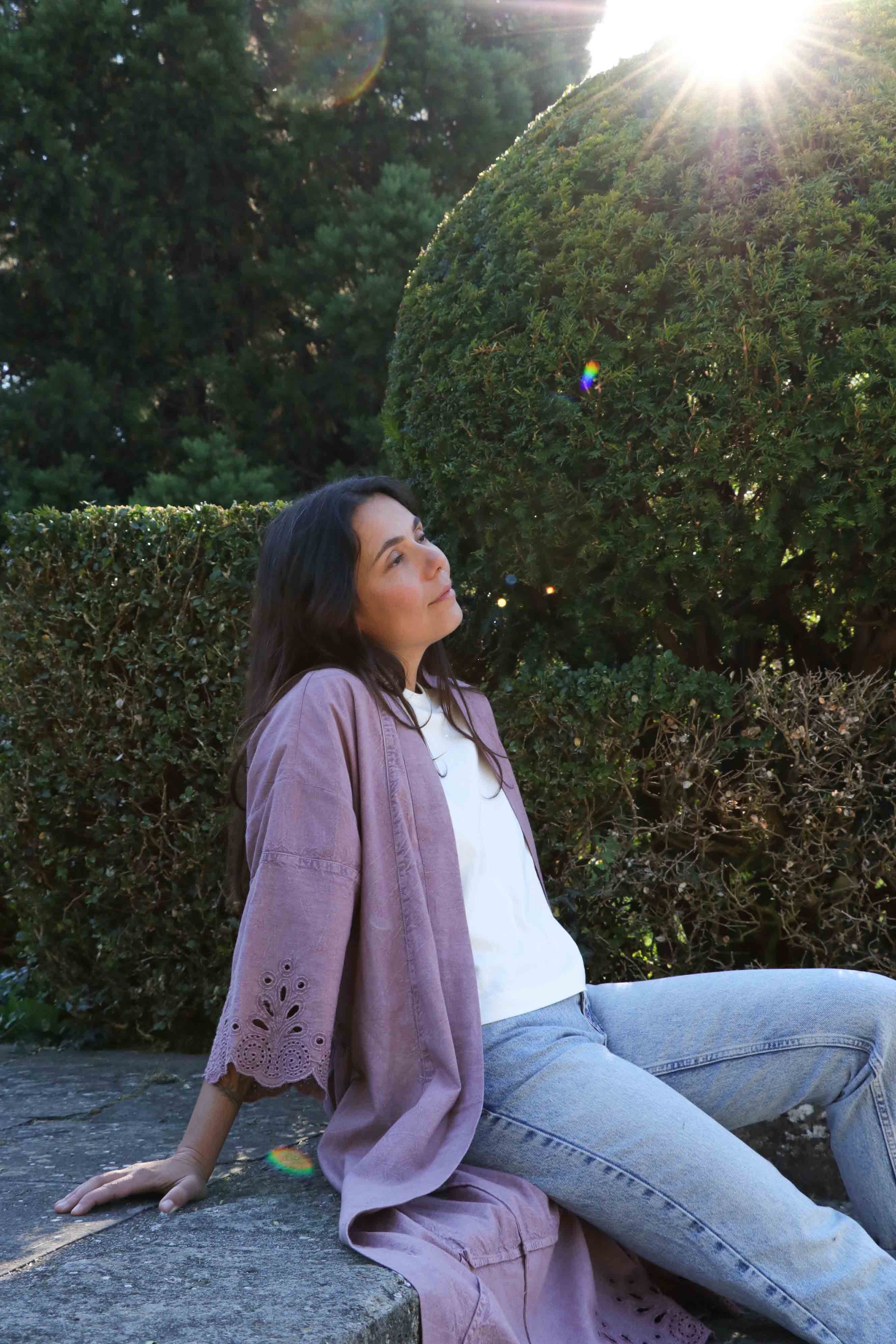 Réalisé à la main en Suisse par l’une de nos stylistes féminines partenaires, ce kimono est une pièce unique, née d’un voyage sensible et d’un regard attentif porté sur les matières oubliées.